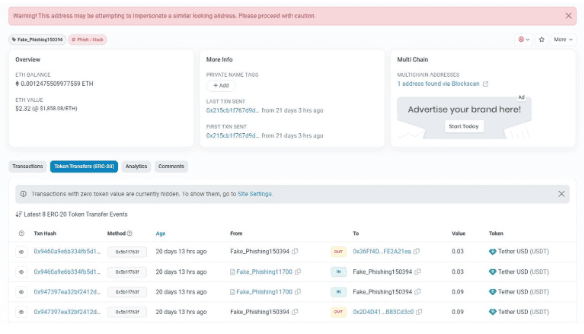 Etherscan 表示,为了保护用户免受称为地址中毒攻击的骗局,它会默认隐藏零价值代币转账。