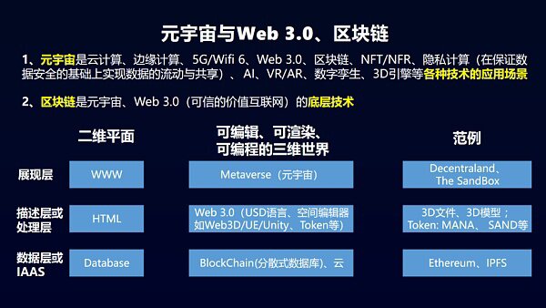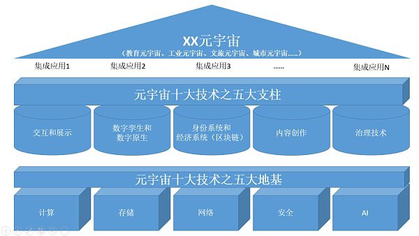 1、 五大支柱:交互和展示、数字孪生和数字原生、身份系统和经济系统(含区块链)、内容创作、治理规则;