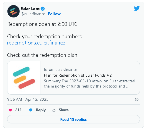 4 月 12 日,基于以太坊的非托管借贷协议 Euler Finance 宣布,在黑客归还上个月 1.97 亿美元闪电贷漏洞中被盗的绝大部分资产后,它将开放赎回。
