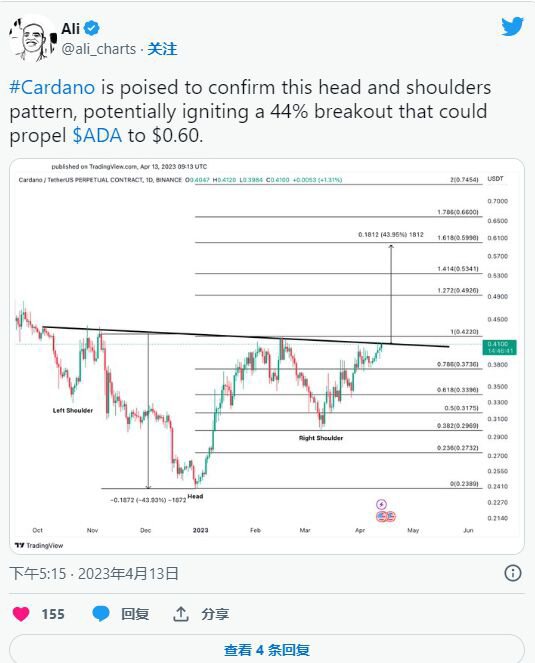 根据加密货币分析师 Ali Martinez 的说法,Cardano 即将确认头肩形态,他说这种图表形态可能导致 44% 的突破,有可能将 ADA 的价格推高至 0.60 美元。