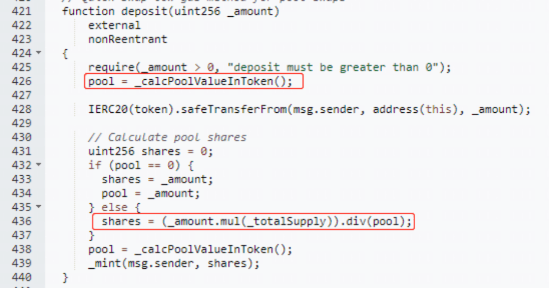 3.接着攻击者调用yearn: yUSDT Token合约的deposit函数质押了90万Tether: USDT Stablecoin,该函数会根据质押量为调用者铸相关数量的yUSDT,计算方式与池子中各种代币余额有关,如下图,此时为攻击者铸了82万的yUSDT。
