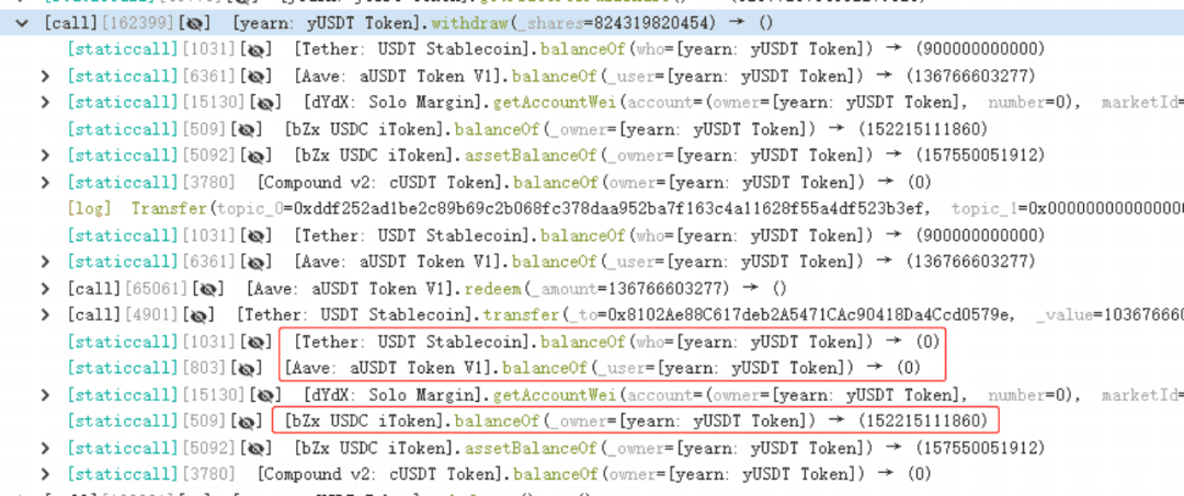 6.随后,攻击者调用yearn: yUSDT Token合约的withdraw函数提取质押资金,此时合约中仅有攻击者之前质押的90万Tether: USDT Stablecoin、初始的13万Aave: aUSDT Token V1以及攻击者转入的15万bZx USDC iToken,而如果一个池子中代币不足的话,会按顺序提取后续池子的代币,此时攻击者将90万Tether: USDT Stablecoin以及13万Aave: aUSDT Token V1全部提取出来,经过本次操作,合约中仅有15万bZx USDC iToken。