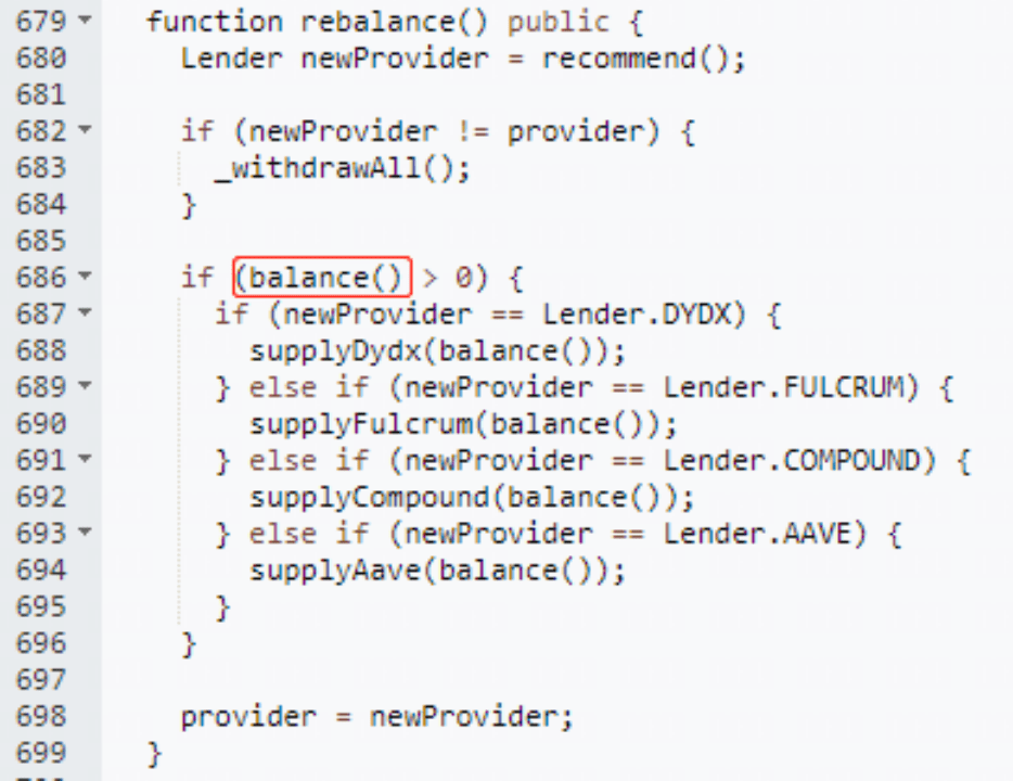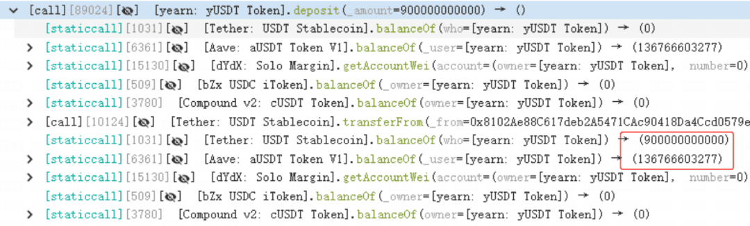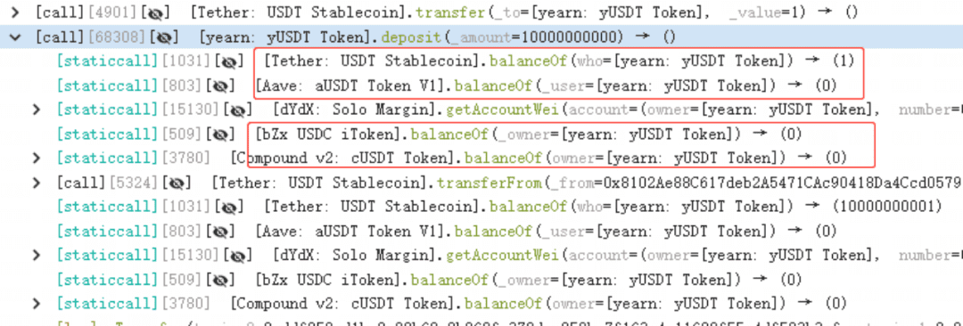 7. 随后,攻击者调用yearn: yUSDT Token合约的rebalance函数,该函数会将当前池子的代币提取出来,并质押到另一个收益更高的池子中,由于第2步操作,合约会将USDT和USDC提取出来,添加到收益更高的池子中,但当前合约仅有bZx USDC iToken,也只能提取出USDC,提取出来后将复投到其他USDT池子,此时复投将跳过。
