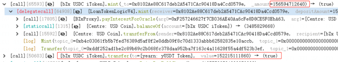 5. 接下来攻击者使用15万USD兑换了15万的bZx USDC iToken,并将其发送给了yearn: yUSDT Token合约,此时,合约中有118万的资金,攻击者拥有90/103的份额,也就是能提取103万资金。