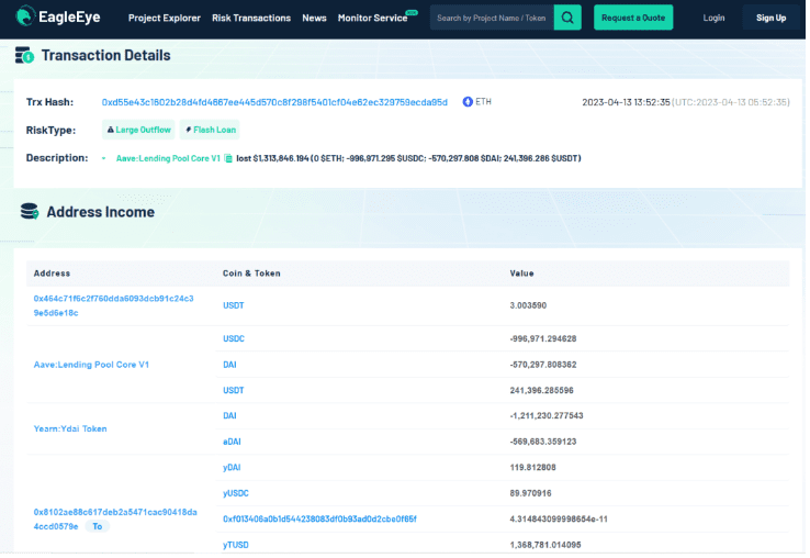 2023年4月13日,据Beosin-Eagle Eye态势感知平台消息,Yearn Finance的yusdt合约遭受黑客闪电贷攻击,黑客获利超1000万美元。