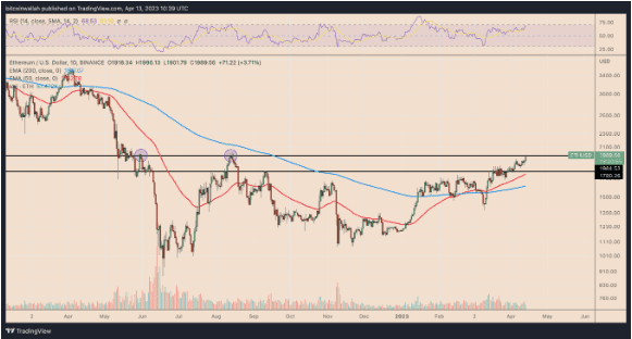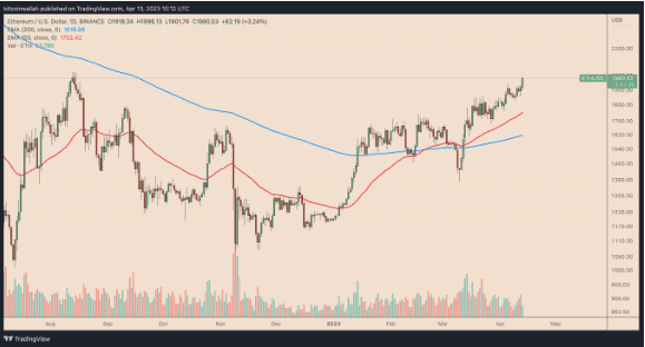 4 月 13 日,以太币在 Coinbase 的价格上涨约 4%,达到 1,996 美元的盘中高点,忽略了 Shapella 升级可能给市场带来的潜在抛售压力。