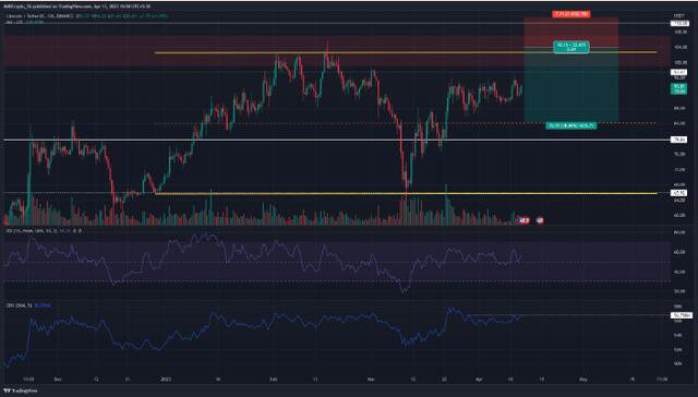 105 美元区域的红色框突出显示了日线图上的看跌订单块。这是在 2022 年 5 月形成的,莱特币在 6 月跌至 42 美元。2023 年,价格走势更有希望,但多头还不足以突破 100 美元。