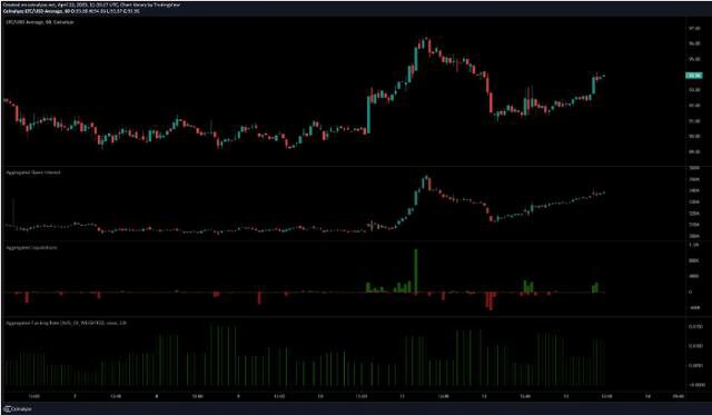 Coinalyze 的 1 小时图表在较低的时间范围内非常简单。在过去一周的波动中,空头和多头头寸持有人都进行了一些清算,但影响不大。