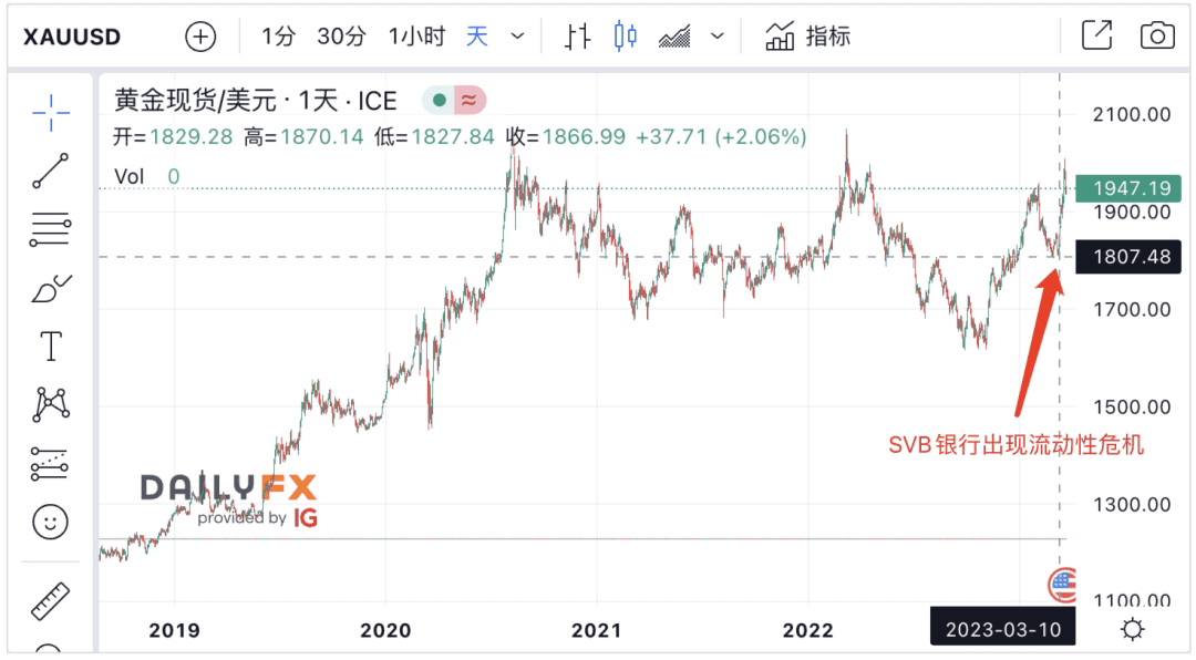 在此次危机中,截止到3月14日,全球金融股市值已经蒸发4650亿美元。同时,银行业的危机也推动了抗风险资产的上涨。在 SVB这场风波开始后,黄金经历了快速的上涨。