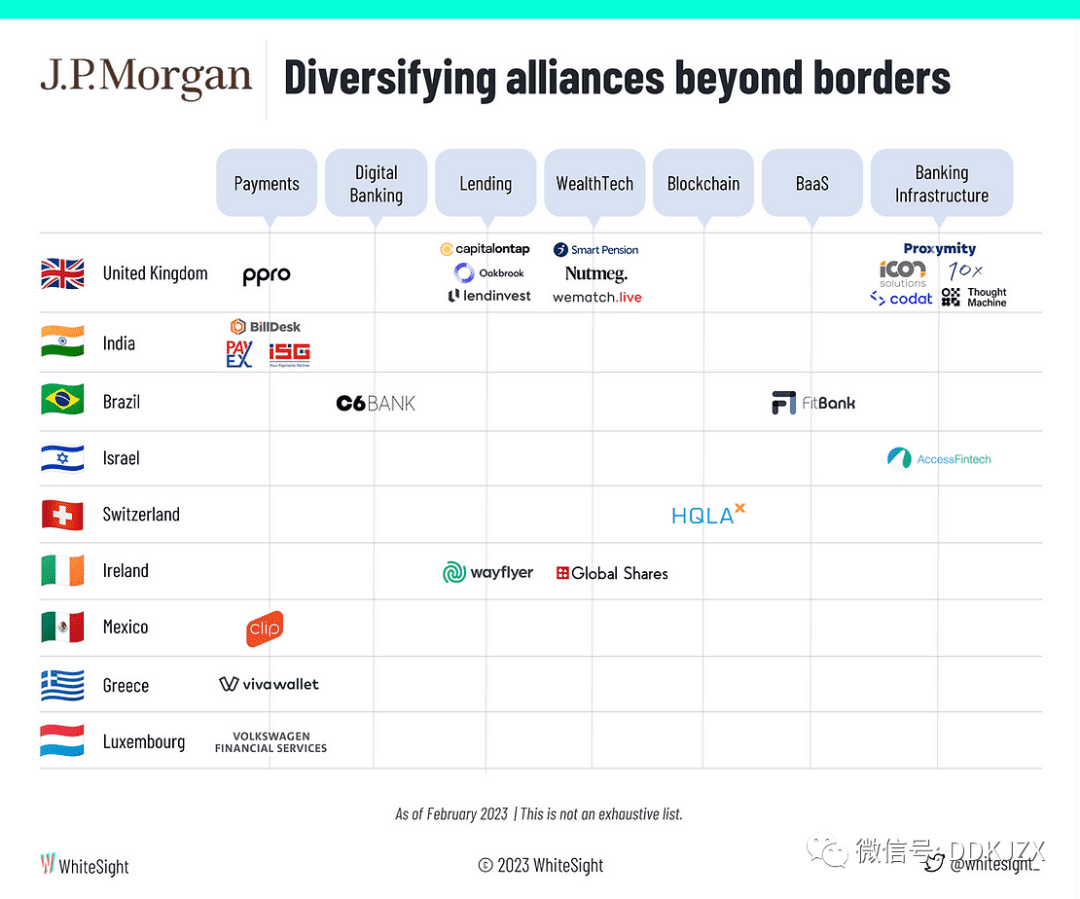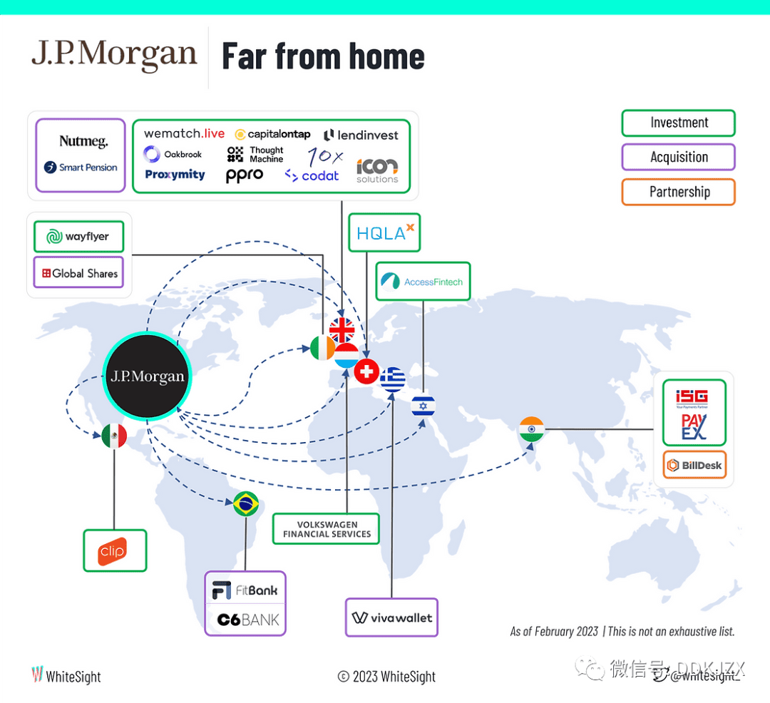 这就是一家银行正在加紧弥合差距的地方——摩根大通通过合作而非竞争引领潮流,押注其金融科技战略,使其产品多样化,并为客户提供结合两者优势的无缝银行体验世界。如今,该战略已远远超出其本土市场——美国——并涉及在全球范围内建立、购买、投资和组建联盟,以探索新的商业模式。