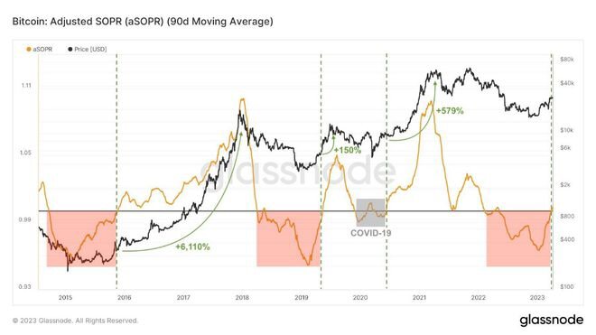 “另一个比特币指标暗示爆炸性增长!从历史上看,aSORP (90d) 低于 1 表示熊市,高于 1 表示牛市。在 2015 年、2019 年和 2020 年,它带来了 6,110%、150% 和 579% 的收益。aSORP 最近升至 1 以上,表明 BTC 准备好呈抛物线走势,”他写道。