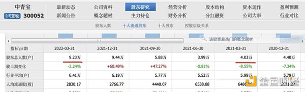 与董事长的套现相反的是,据市场数据显示,2021年一季度,中青宝有散户4万人,到了2021年底变为了9.4万人,直到2022年一季度,依然有9.2万散户。一个合理的推测是,这多出来的五万人冲着元宇宙的概念涌入,但并没有能在合适的时间退出。