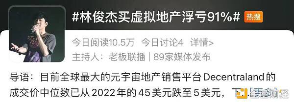 已经从舆论场中消失很久的元宇宙,最新的一条消息,是林俊杰的元宇宙房产投资大跌了91%。