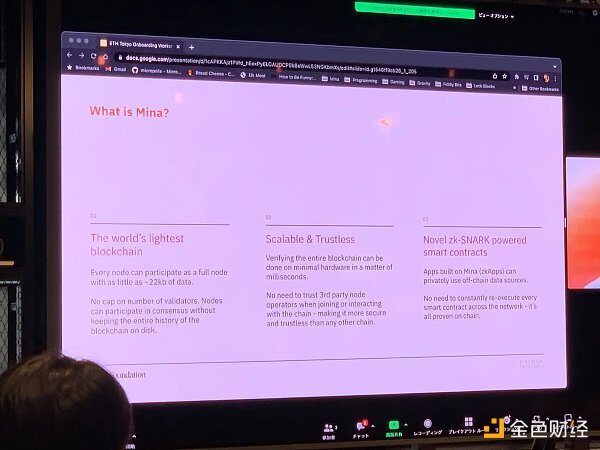 关于 Mina Protocol 的介绍,由该项目的创始人 Jason Steinhauser 提供。Mina Protocol 是一个基于 zk-SNARK 的隐私保护一层区块链协议,它允许在链下处理数据和计算,并在链上进行验证。应用程序(zkapps)可以使用 TypeScript 编写,并使用 JS 库和 VSCode 进行支持。