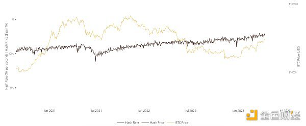 OKLink 数据显示,目前比特币全网算力约为 342 EH/s,难度约 48 T。而查询历史数据,我们不难发现。自 2021 年大牛市结束以来,比特币价格持续探底,但算力却稳健上升。矿工的挖矿成本并未显著降低。