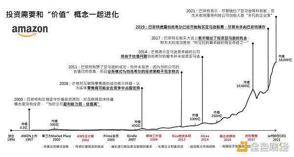 亚马逊并不是一家闷声发大财的独角兽, 97 年就上了市,Jeff Bezos 每年都会给股东写一封信,只要你认真读,不难发现这是一家永远持有“第一天心态”的伟大的互联网企业,他们连续 30 年持续不断地在创造价值,只不过他们不是在用华尔街习惯的 PE/PS 的方式,也不是在按照巴菲特的价值逻辑呈现而已。亚马逊是在用新的互联网技术,新的技术范式在创造价值,而新技术范式支撑的新商业模式或者新事物需要用新的价值评估体系,否则你会输得很惨。