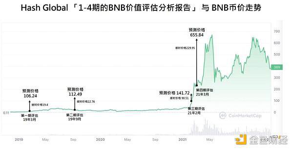 我们在过去几年一共做了四期报告。19 年 3 月做了第一期,我们认为 BNB 被低估,当时币价 19 ,我们预测 106 。