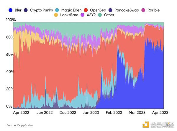 总部位于旧金山的 Blur 的迅速崛起让业界专家感到震惊,因为它能够超过总部位于纽约的 OpenSea,尽管其他有充足资金的创业公司尝试超越 OpenSea 但均告失败。OpenSea 在 2021 年夏季占据了 NFT 市场的主导地位,即使在竞争对手如雨后春笋般涌现时,OpenSea 在 2022 年底仍占据了市场的 75% 份额。根据 Dapp Radar 的数据,它从 188 亿美元的交易量中获得了 4.72 亿美元的营收,交易手续费为 2.5% 。一年前,Coinbase 推出了自己的市场与 OpenSea 竞争,但结果非常糟糕,至今仅录得 600 万美元的销售额。