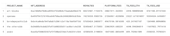 而高达18.78亿美元的版税中,以加密生成艺术平台ArtBlocks的8,367万美元排名第一,Opensea则以7,427万美元排名第二,至于第三到第五名分别是:无聊猿(BAYC)的5,765万美元,Otherdeed for Otherside的5,245万美元,Azuki的4,250万美元。
