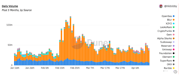 此外,虽然加密市场出现复苏迹象,但NFT市场依旧不见起色。根据Dune数据显示,自NFT聚合平台Blur2月14日发行空投后,整体NFT市场交易量开始骤降,相较BLUR代币发行首日的1亿美元,当前交易量仅剩下3,600万美元,短短两个月内已下跌超64%。