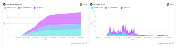 根据加密数据网站Flipside数据显示,以太坊NFT用户过去两年累计支付逾38亿美元版税、平台费和交易Gas费,其中版税费用达18.78亿美元,平台费用约为8.65亿美元,交易Gas费为10.82亿美元。