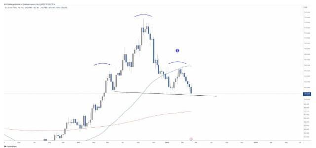 2个月后,右肩已经形成,正在测试颈线。这仍然只是一个想法,但如果这条黑线被打破,这将得到证实,我们应该会看到美元持续走软。