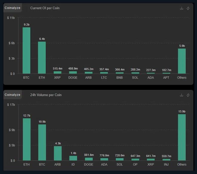 他指出,山寨币和以太坊(ETH) 在 24 小时交易量方面处于领先地位。此外,“这里有大量 OI [未平仓合约] 转向山寨币,”他补充道。