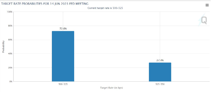 数据公布后,市场对美联储6月利率决议加息的预期进一步下降,6月利率决议上加息25个基点的概率来到27.4%。