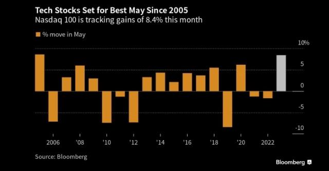 彭博社汇编的数据显示,仅本月,纳斯达克100指数就上涨了8.4%,有望创下2005年以来最佳的5月表现。