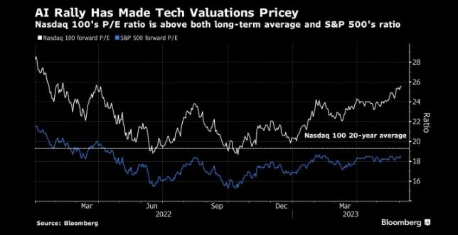 图:纳斯达克100指数的市盈率正快速脱离长期平均水平 来源:Bloomberg