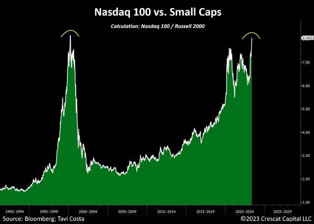 另一个显示市场明显分化的指标,是纳斯达克100指数与代表中小企业的罗素2000指数的比例,这一比例目前已经攀升到了8.16,已经到达了2000年互联网泡沫破裂前夕的高点。