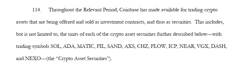 2、SEC 在诉讼中指控以下代币是证券 SOL、ADA、MATIC、FIL、SAND、AXS、CHZ、FLOW、ICP、NEAR、VGX、DASH 和 NEXO。与起诉币安的文件相似,SEC 同样强调列出的代币是“包括但不限于”。