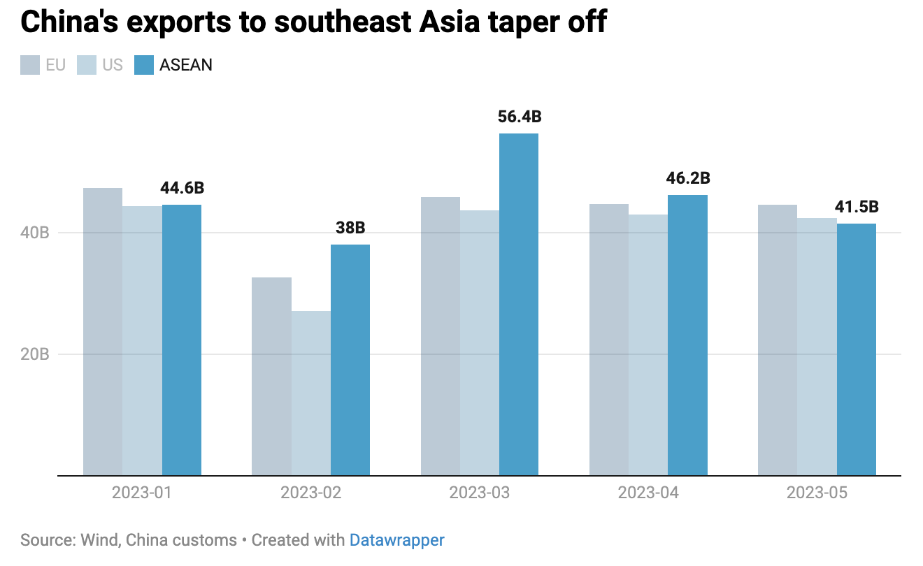 “鉴于经济明显下滑,对东盟的出口已从主要推动力变成拖累因素,对5月份整体增长的贡献为-2.4个百分点。”