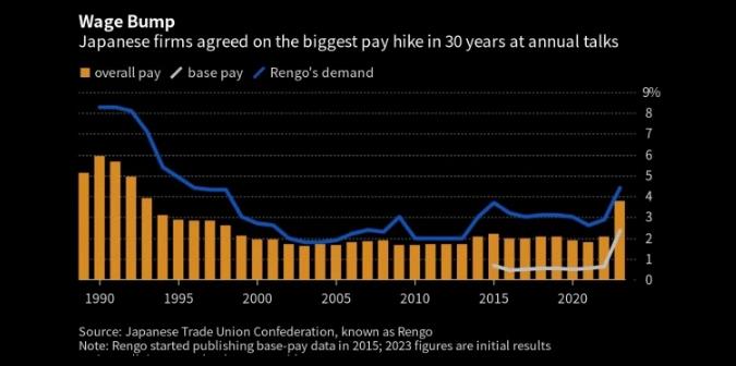 图:日本企业和工会在年度谈判中就30年来最大幅度的加薪达成一致 来源:Bloomberg