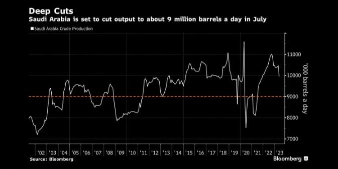 图:沙特阿拉伯将在7月将产量削减至900万桶/天 来源:Bloomberg
