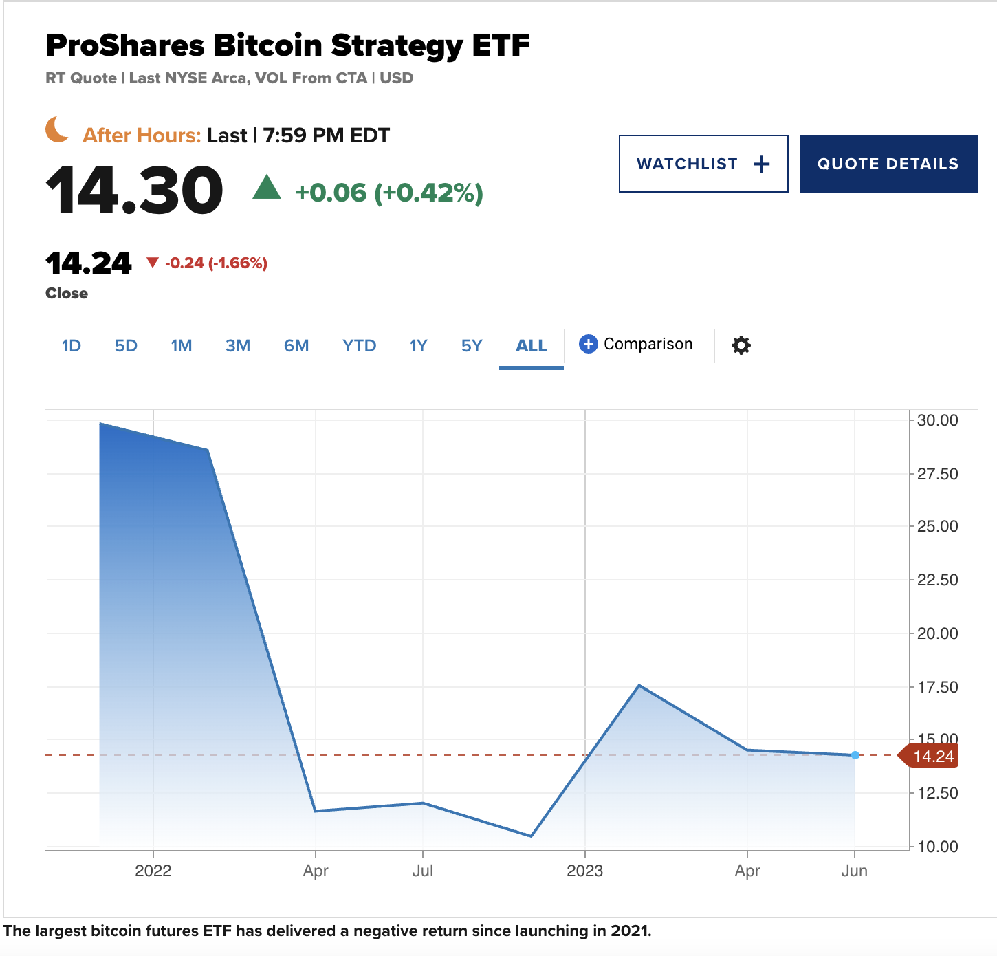 比特币期货ETF于2021年首次推出,但ProShares比特币战略ETF (BITO)是唯一一家已经发展到相当规模的公司,拥有约8亿美元的资产。FactSet的数据显示,自推出以来,该基金的总回报率已经下跌了40%以上。比特币的价格在BITO推出后不久,比特币就创下了历史新高,自峰值以来下跌了60%以上。