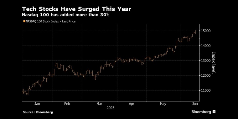 图:在人工智能主题炒作推动下,纳斯达克100指数今年涨幅已超过30% 来源:Bloomberg