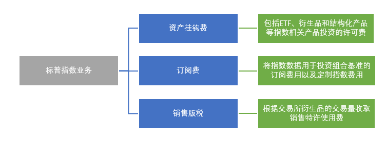 以美国标准普尔公司为例,目前该公司的指数业务(标准普尔道琼斯指数)大约占其总收入的11%,而指数收入具体有三大来源:资产挂钩费,订阅费,销售版税。