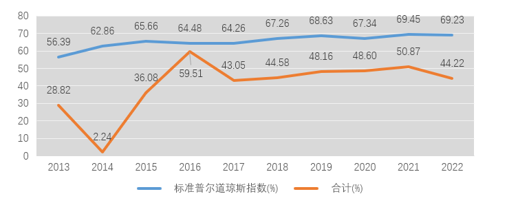 首先,指数业务的毛利率和营业利润率很高。以标普为例,在过去十年间,标普公司的指数业务保持在平均 83% 左右的毛利率和 65% 左右的营业净利润率,高于标普公司的合计同类指标。主要原因在于若扣除通胀因素,指数业务的成本较为固定,随着用的客户的增多会形成规模效应,导致成本率下降,利润率处于高位。