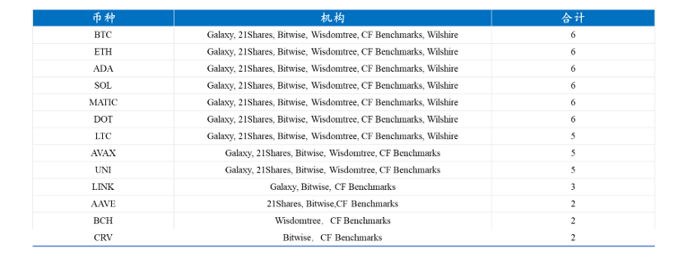那么就当前市场上的虚拟资产指数而言,哪些虚拟资产有被允许向散户提供交易的可能?根据整理市场数据,目前提供虚拟资产指数并受市场认可的机构主要有 Galaxy,21Shares,CF Benchmarks,Bitwise,Wisdomtree 和 Wilshire 六家机构。
