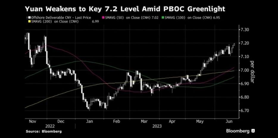 图:在中国人民银行开绿灯的情况下,人民币贬值至关键的7.2水平 来源:Bloomberg