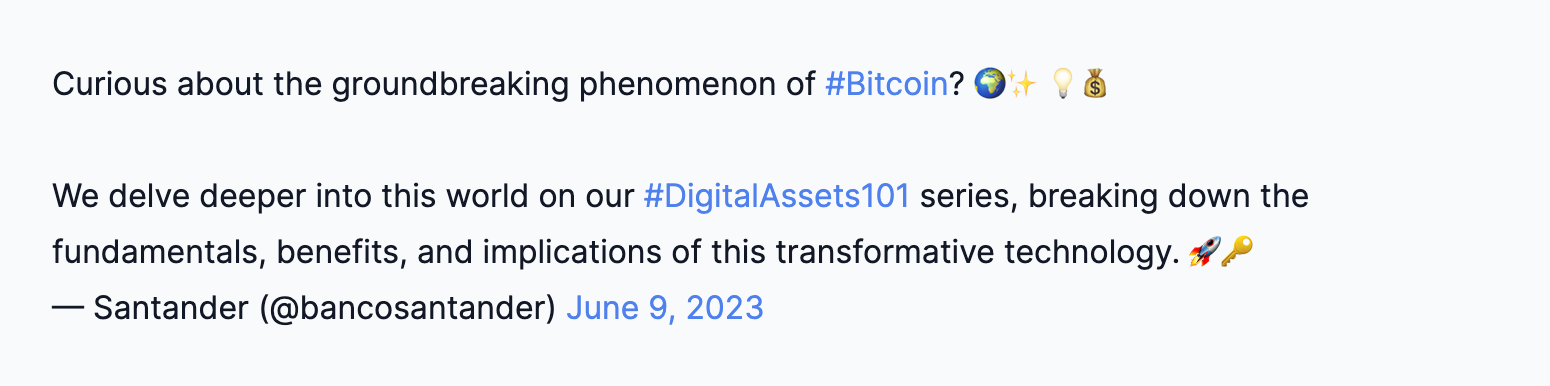 碰巧的是,桑坦德银行(Santander Bank)最近在其网站上启动了“数字资产101”教育系列,“打破了这种变革性技术的基本面、好处和影响,”该公司在其Twitter简介中介绍了6月9日关于比特币的第一堂课。
