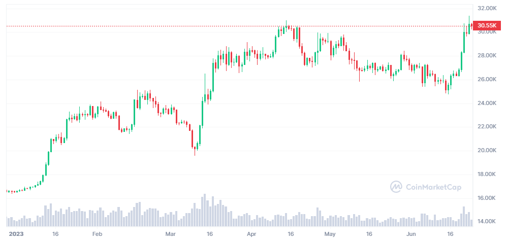 持续超过31,000美元将标志着我们进入一个新的阶段,市场参与者开始对之前的一些监管焦虑进行重新定价。尽管一些监管机构的言论显得很对立,但比特币现货ETF的申请放大了机构对加密货币仍然感兴趣的观点。