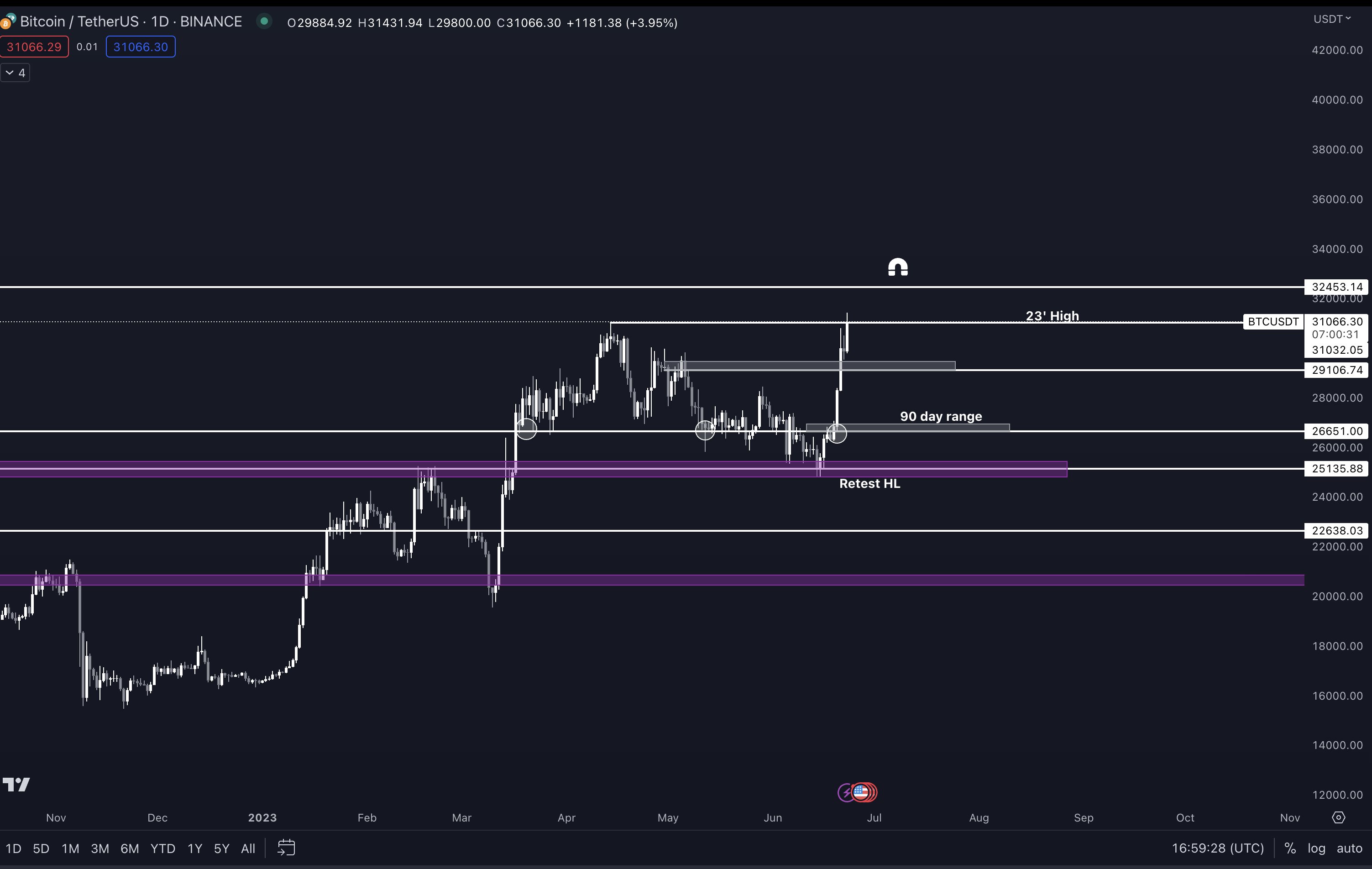 “如果比特币收盘价低于之前的高点,那么在当地是一个观察比特币每日收盘价的好地方。不管怎样,我认为我们能达到32,000美元。目前在低时间框架/中期框架的支撑位为29,000美元。”