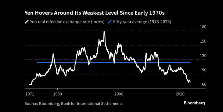 图:长期来看,日元仍徘徊在20世纪70年代初以来的最低水平 来源:Bloomberg