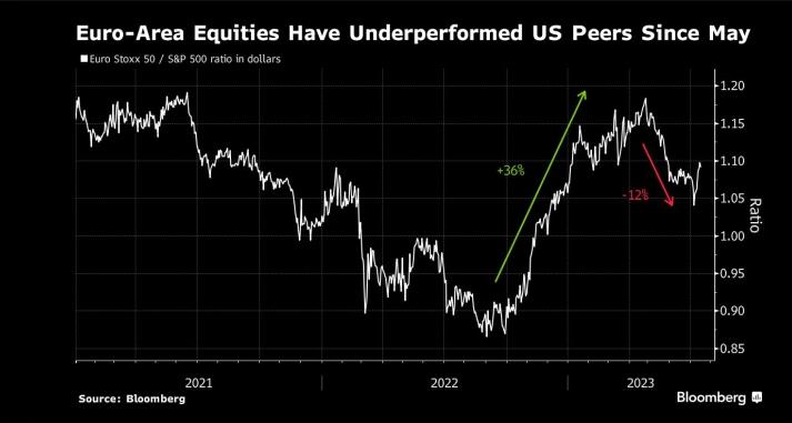 图:自5月份以来,欧元区股市的表现一直落后于美国 来源:Bloomberg