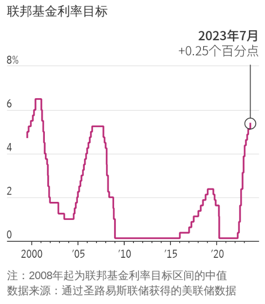 北京时间周四(7月27日)凌晨2点,美联储(FED)联邦公开市场委员会(FOMC)加息25个基点,至5.25-5.5%的区间,为2001年以来的最高水平,政策声明为未来继续加息敞开大门。