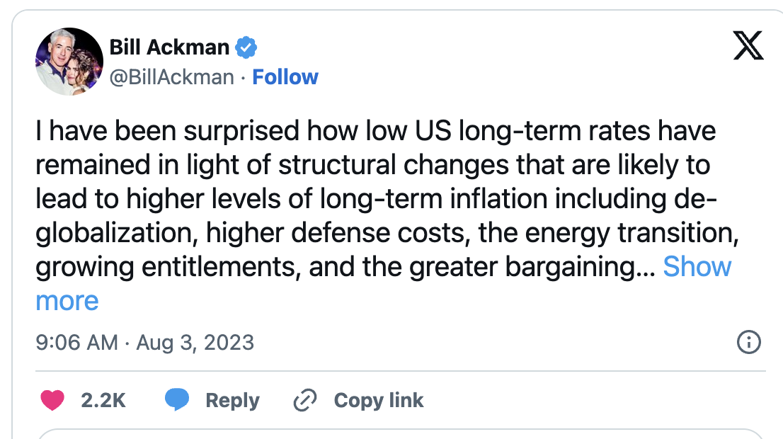 阿克曼预计通胀率将持续保持在3%左右,并表示30年期美国国债收益率可能”很快”达到5.5% 。