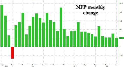 最重要的是,如果基于“大数据”预测或月度ADP报告的小道数据略微准确,并且就业人数扭转了最近的下降趋势,那么再次加息的可能性将会飙升,在赤字飙升和本季度1万亿美元债券发行的情况下,这将使10年期国债收益率达到2023年的新高,迅速接近4.50%。
