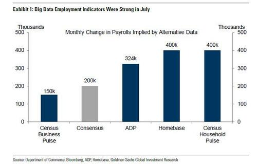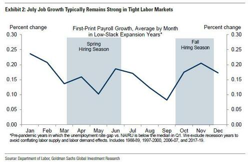 不同看法:高盛在发布就业报告之前一直看涨,但多数情况下都处于市场共识的错误方向。高盛在其预测中预计,7月份就业人数将高于市场共识的25万人,因为“7月份就业增长趋向于保持强劲,因为劳动力市场紧张——反映出年轻暑期工的强劲招聘——我们跟踪的就业增长的三个替代指标表明,就业增长速度强劲。”该银行也比普遍看法更为乐观,估计失业率小幅下降0.1%至3.5%(普遍看法为3.6%),反映出家庭就业增加和劳动力参与率不变,为62.6%。该银行对工资的看法与普遍看法一致,预计平均时薪将增长0.3%,这将使年增长率降至4.2%,“反映出工资上涨压力减弱和积极的日历效应(普遍看法为0.3% / 4.2%)。”